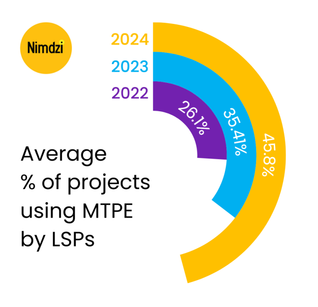 根據(jù)最新的 2025 年 Nimdzi 調(diào)查數(shù)據(jù),MTPE的平均采用率在兩年內(nèi)激增75%,從2022年的26%攀升至2024年的46%。然而,廣泛的采納并未帶來(lái)均勻的效率提升,不同組織間的實(shí)施效果呈現(xiàn)出顯著落差,這表明巨大的效能潛力仍未被充分釋放。